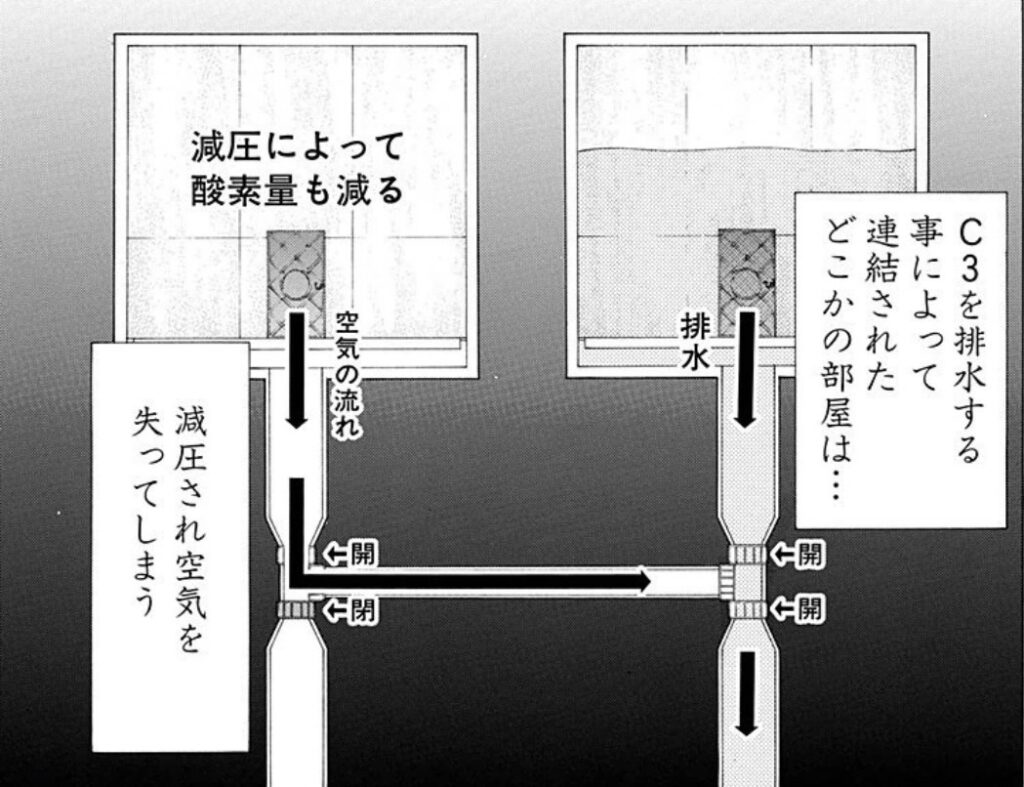 最後に南方が仕掛けたトラップについて解説します。この勝負の舞台である実物大ラビリンスは気密性の高い構造を持ち、複数の部屋を排水パイプを用いて同時排水可能な造りになっています。南方はC3をポンプにより水没させてから排水する際、C3とC2を連結するパイプのバルブを開放することによりC2を減圧させ酸素量を著しく低下させました。