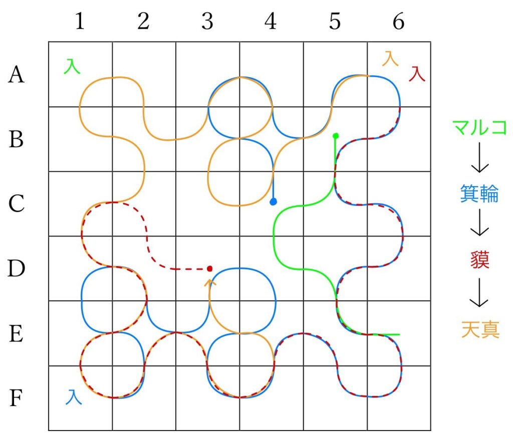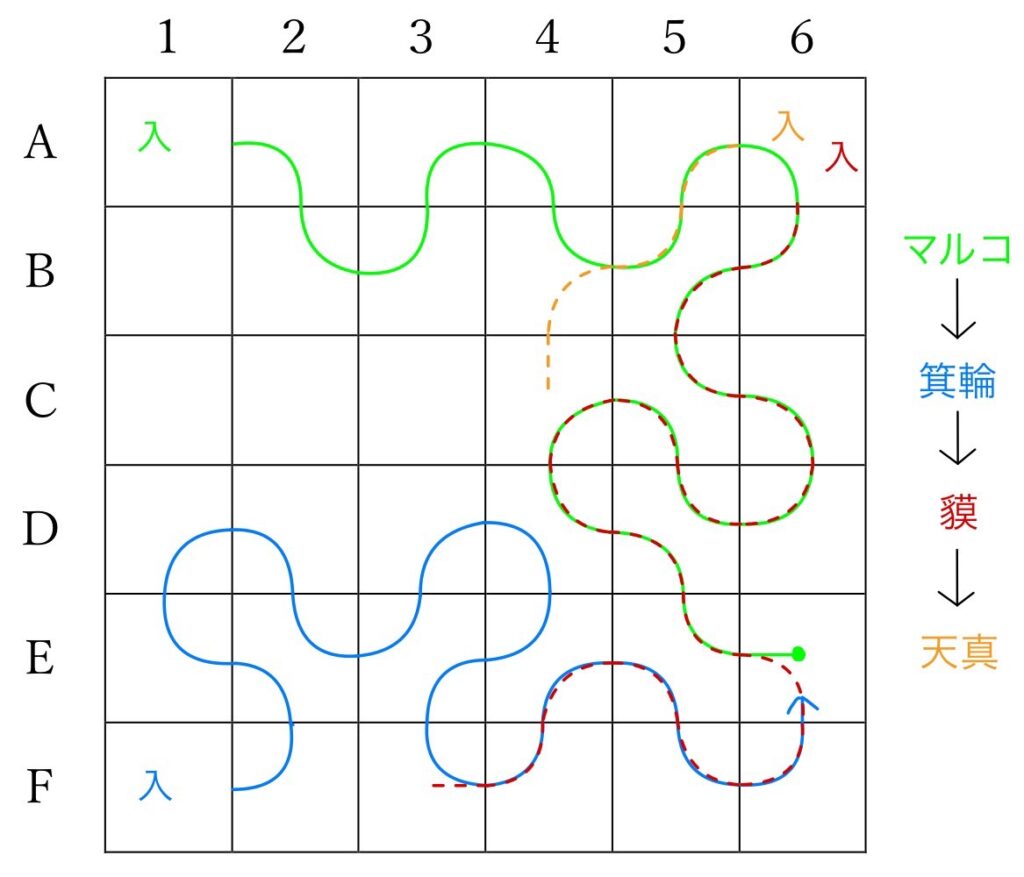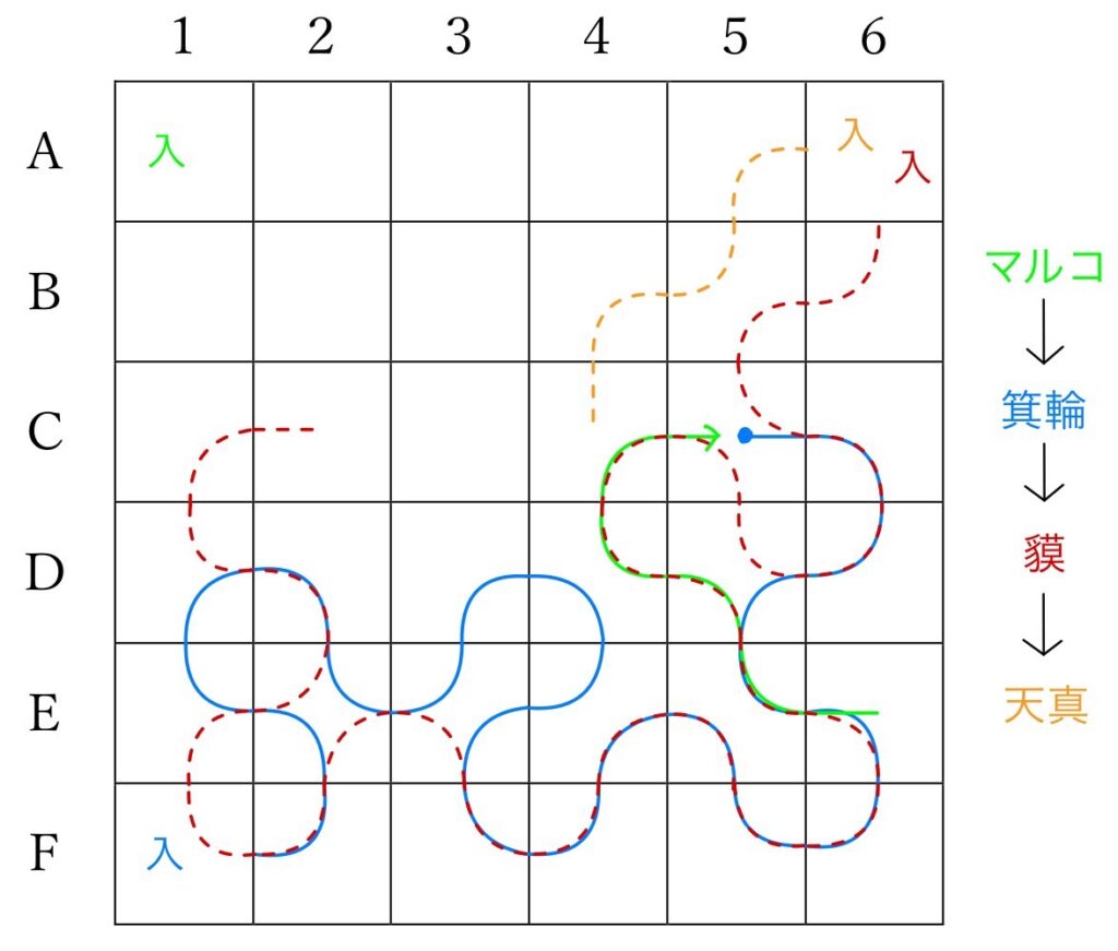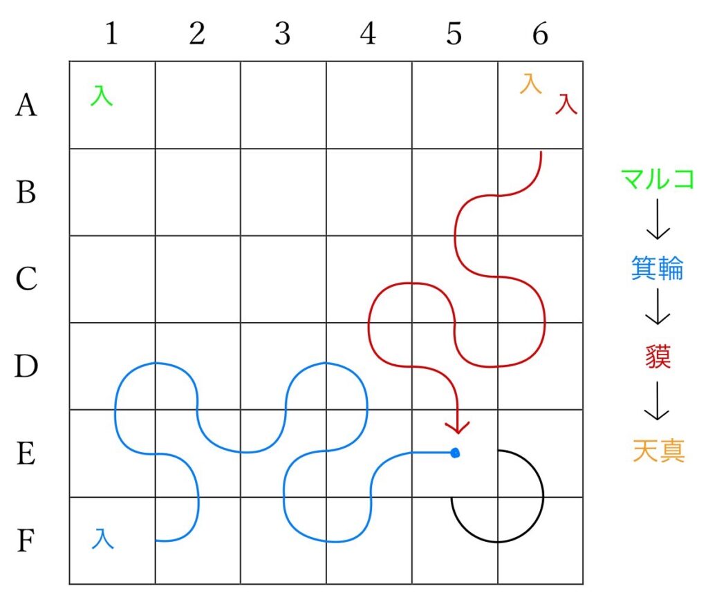 スタート時に同室にいた天真との駆け引き、自身の迷宮の道筋から貘は4.5ターンで自分の現在地と迷宮の法則をおおよそ理解しました。そして貘がE5に入るとそこには敵の戦闘要員である箕輪が待ち構えていました。その時点での4人の状況は以下の通り、赤線が貘の道筋、青線が箕輪の道筋です。